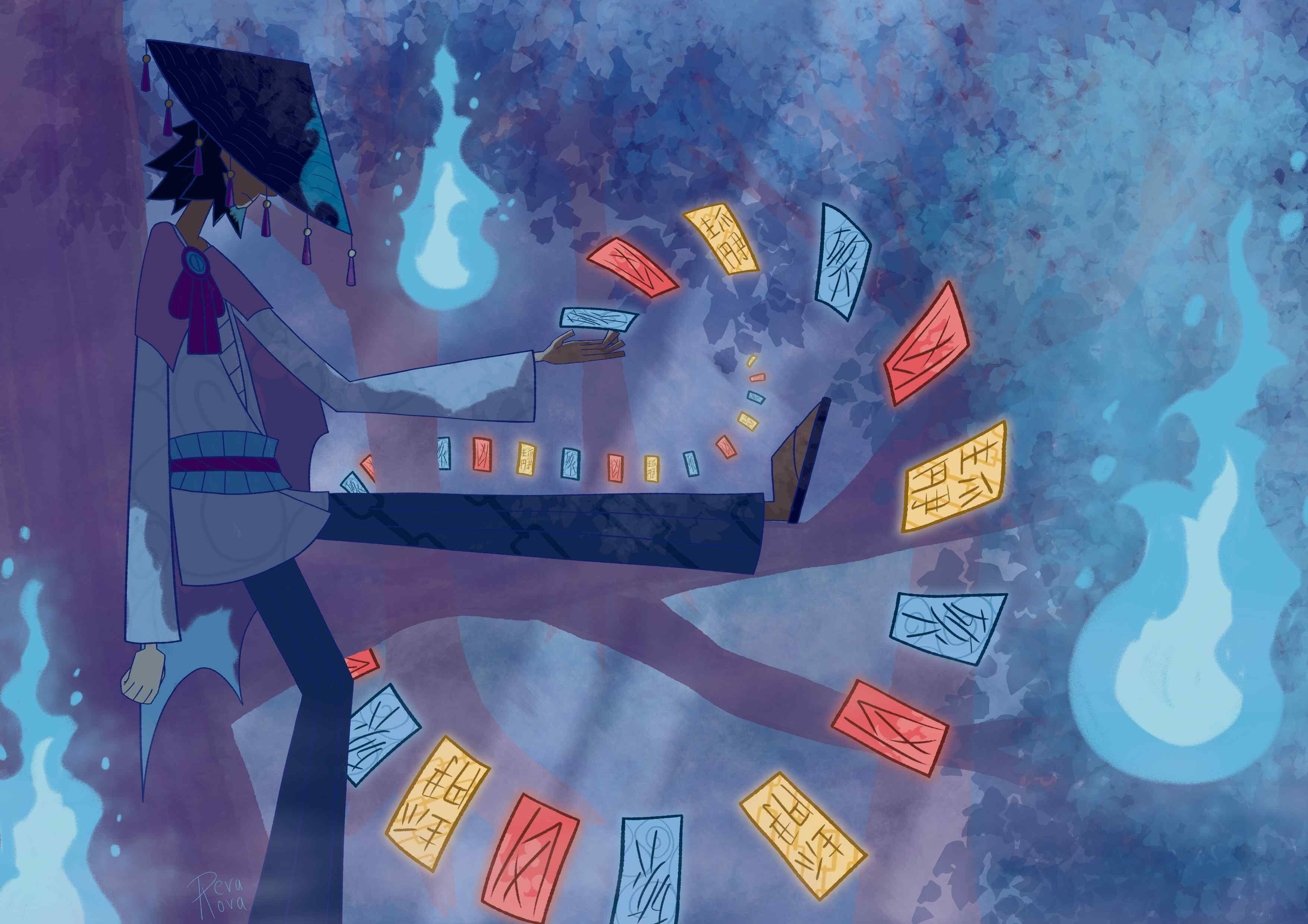 On the outskirts of the village, where the moonlight touched the forest canopy strongest, another spirit stood with the strength of sunfire in his eyes. This was Jayce, the kanmei of courage and protection.